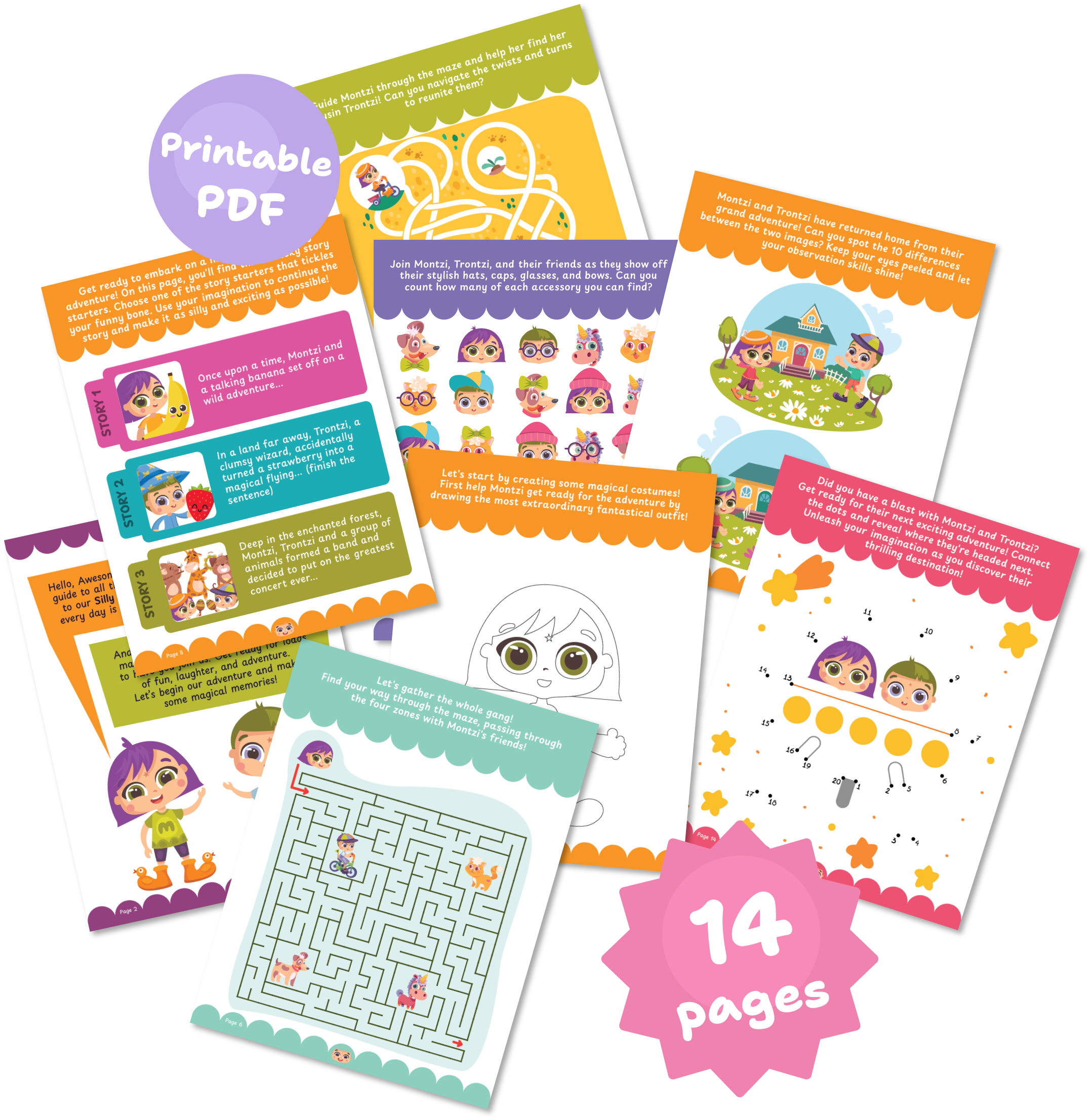 This activity book is truly an interactive workshop for the imagination. From designing fantastical costumes to finishing hilarious stories about talking bananas and clumsy wizards, this digital book is packed with activities that spark creativity and laughter. Whether your little one loves solving puzzles, drawing magical items, or navigating twists and turns, Montzi and Trontzi have a "Silly Adventure" waiting just for them.
